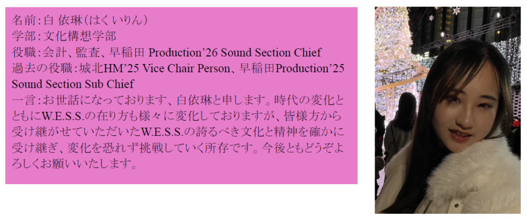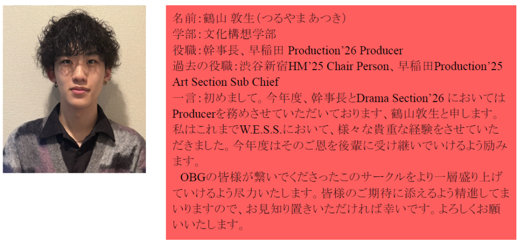 この度2025年度の執行部、Section から2026年度の執行部、Sectionに代替わりさせていただいたため、26年度の五役と各Section Chief におきまして、この場をお借りしてご挨拶させていただきます。